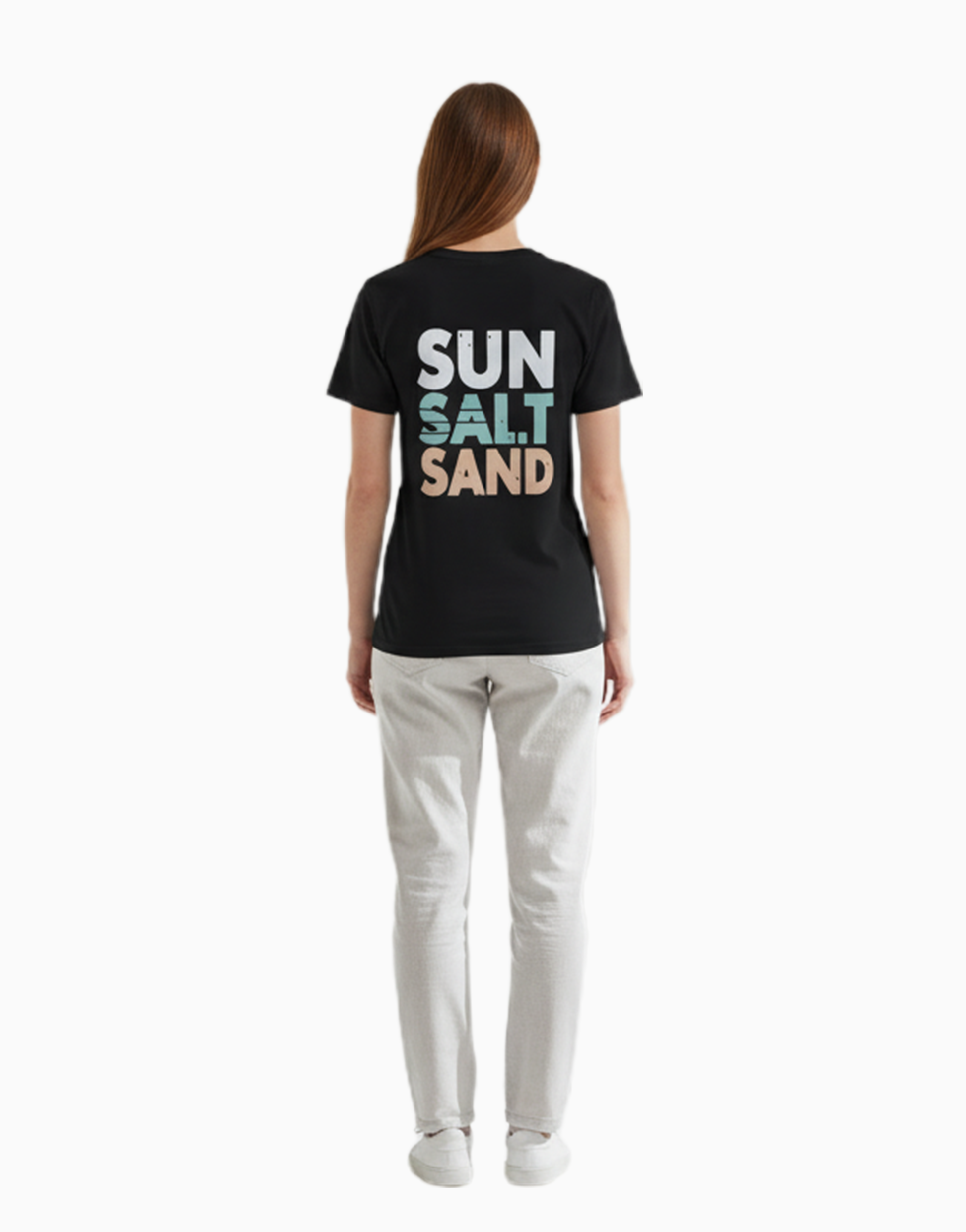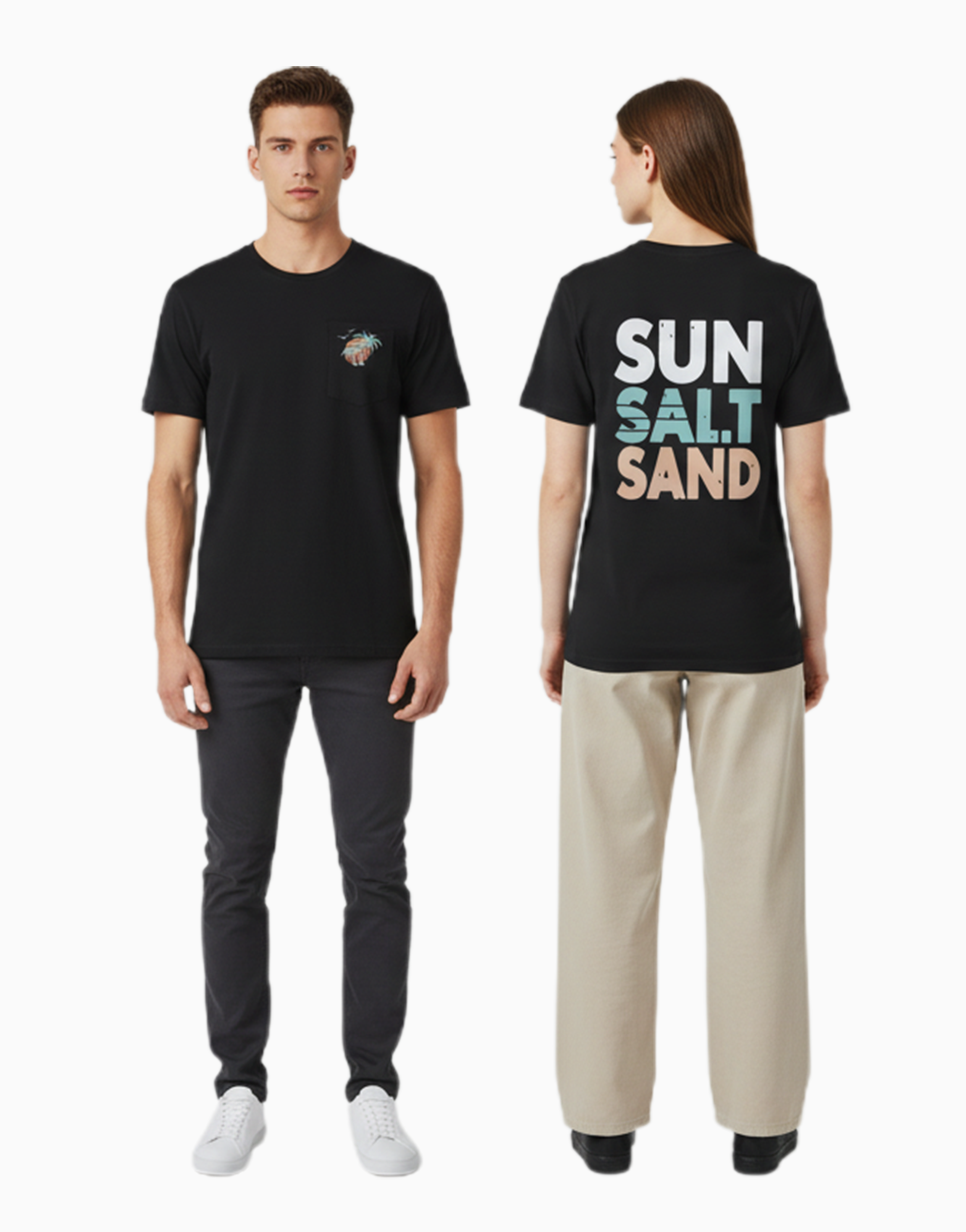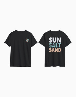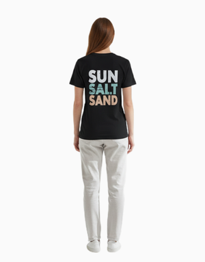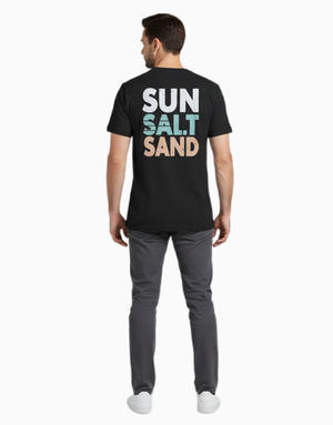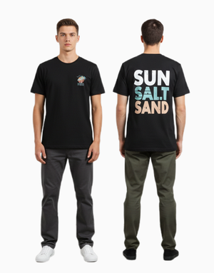 Bring the beach wherever you go. Featuring a tiny palm-sun graphic on the front and bold “SUN SALT SAND” typography on the back, this t-shirt delivers pure tropical energy. Soft, breathable, and made for chill days.