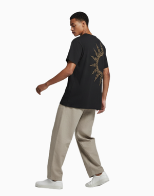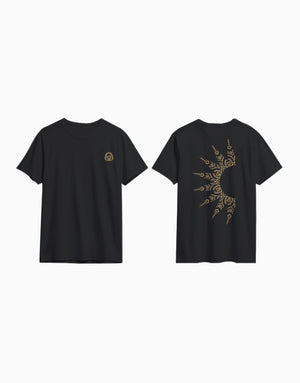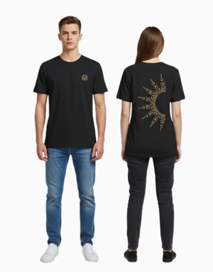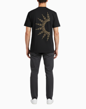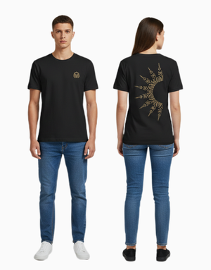 A statement piece inspired by bold energy and modern minimalism. The Tribal Sunburst T-shirt features intricate golden patterns radiating across the back, symbolizing strength and creativity. Made from 100% soft cotton with a round neck and short sleeves, it’s your go-to for comfort and edge in one look.