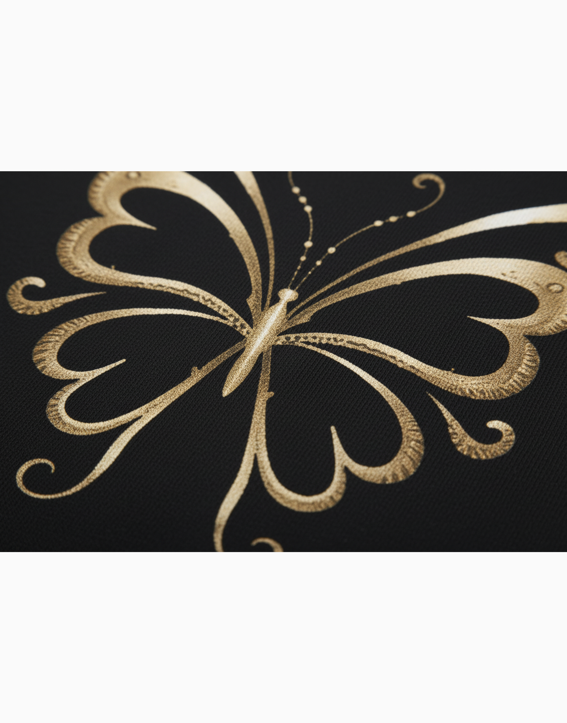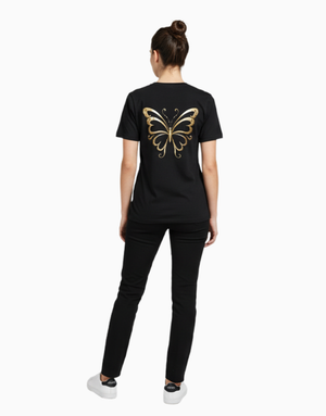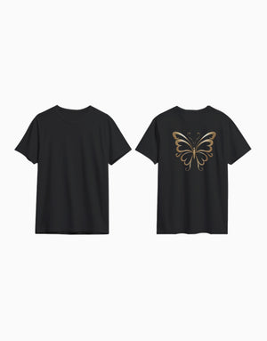 A beautifully detailed golden butterfly on the back, paired with a clean front. A stylish and graceful design for those who love subtle sparkle and timeless charm.Crafted from 100% soft, breathable cotton.