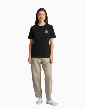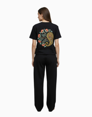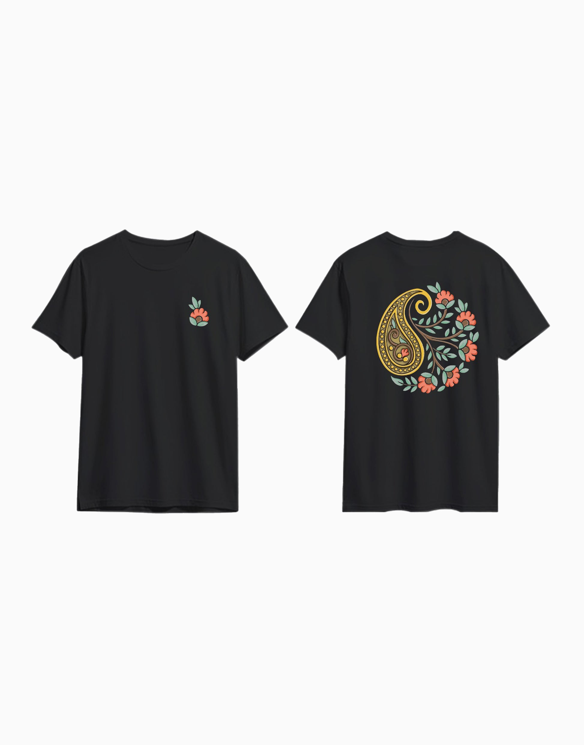 Bring a touch of artistry to your everyday wear with our Unisex Relaxed fit t-shirt "Paisley Floral". The subtle front flower detail and the intricate paisley print on the back make this black t-shirt a true standout. Crafted for comfort and designed with a creative twist, it’s perfect for those who love a hint of bohemian charm.
