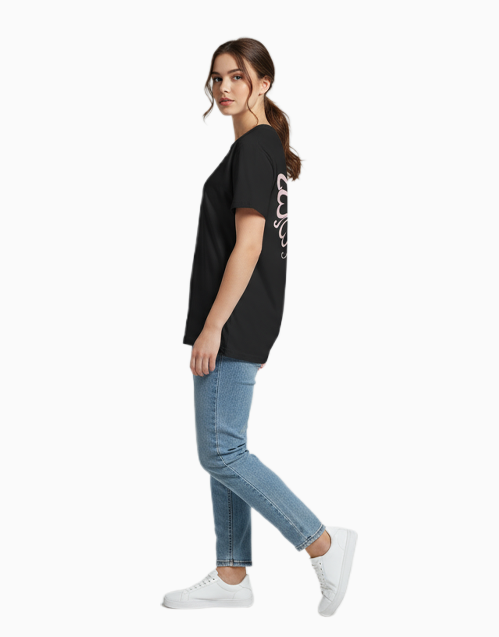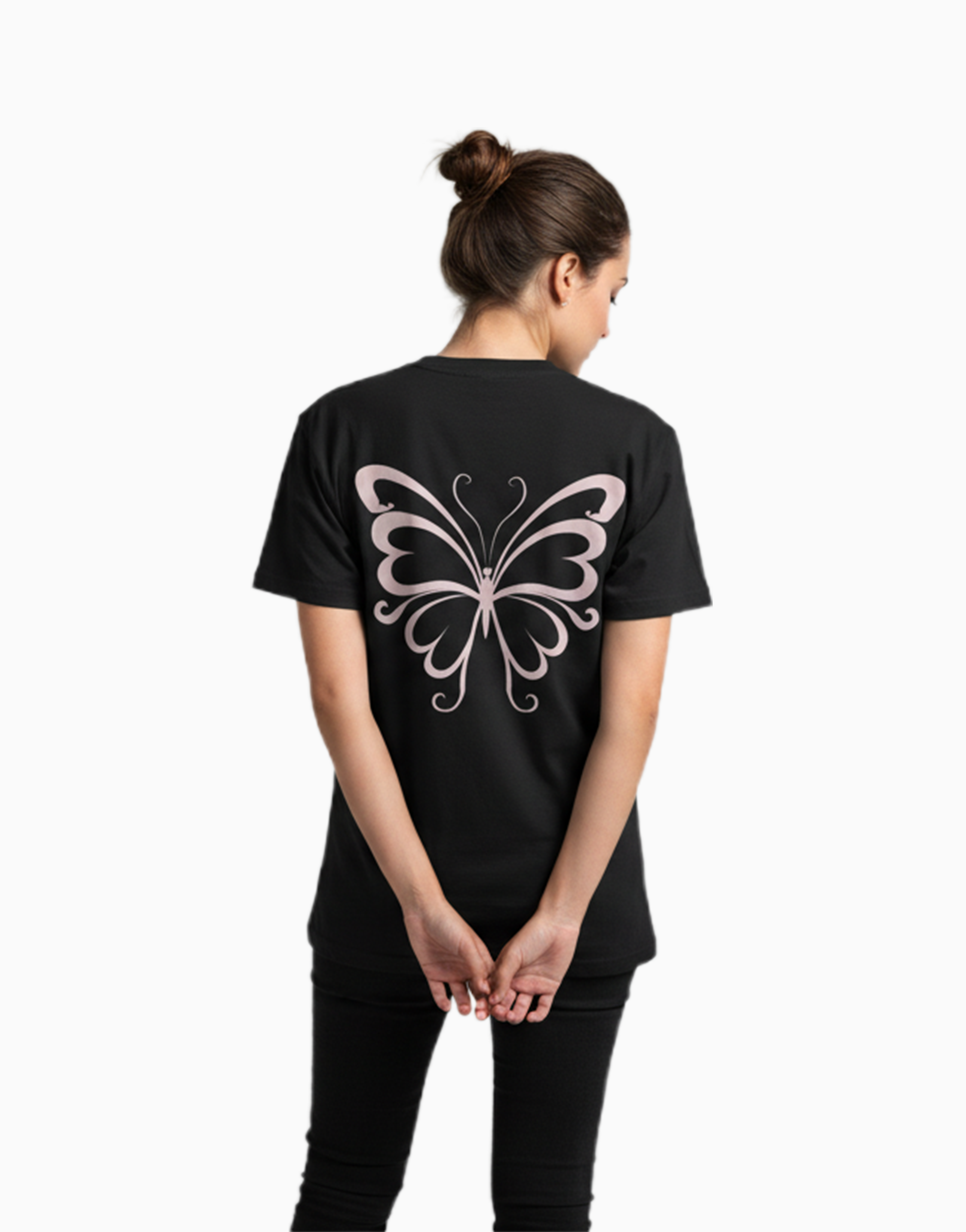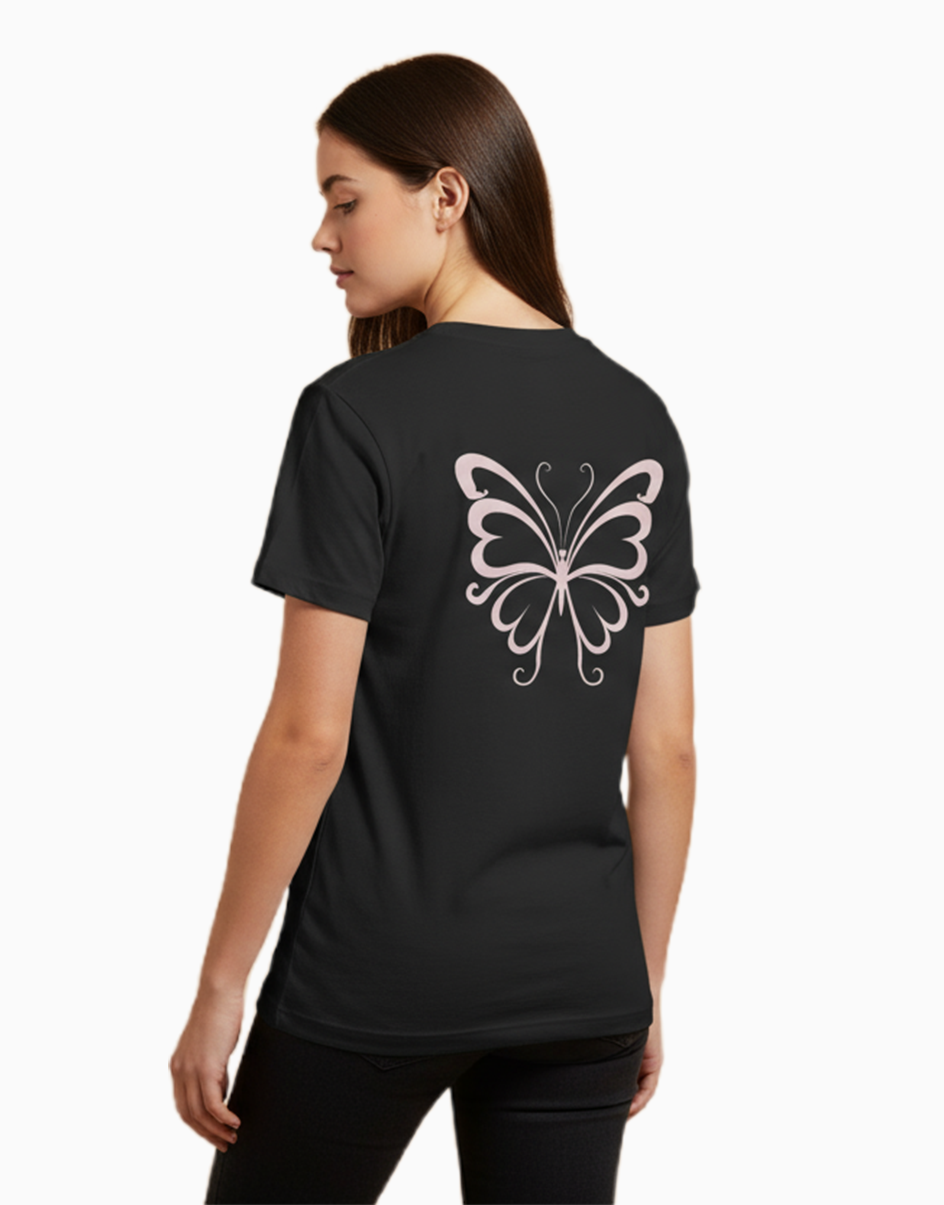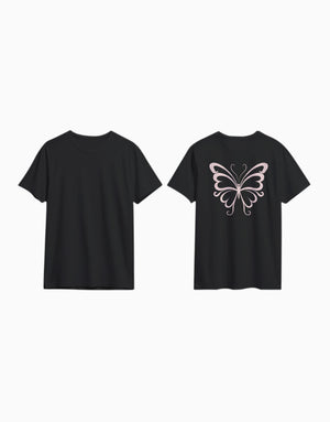 A beautifully detailed pink butterfly on the back, paired with a clean front. A stylish and graceful design for those who love subtle sparkle and timeless charm.Crafted from 100% soft, breathable cotton.